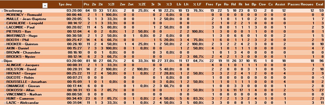 Ci-dessous la Box-score comprenant les écarts (En jaune la Box-score, en blanc les stats issues de la revue, et en rouge les stats étant en écart)